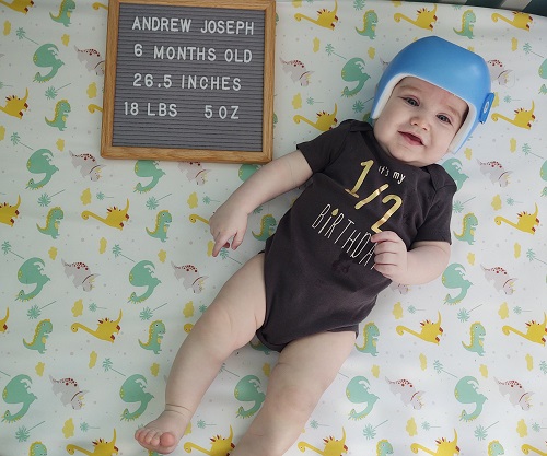 It is Andrew’s 1/2 birthday (he is six months old today). We measured him, weighed him, and put him in his special onesie and took our Milestone pictures. We decided to take his pictures in his helmet so we’d remember it.