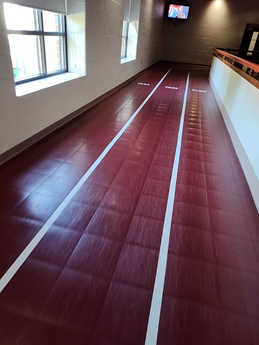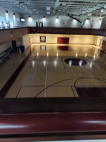The track is on the second floor and goes around the top of the basketball court. The day we walked it without headphones on, it was weird. The track is almost like a plastic/vinyl type material. My shoes were very loud as I walked on it. Now, when I drop her off, I put on my headphones and don’t even notice it.