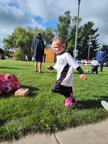 It was pretty chilly that morning and I wish we had all dressed a bit warmer. As much as we thought he’d love running around, he (and the rest of the 2-3 year olds) were done about 30 minutes in. He did love when they sat up some cones in front of the net and he had to try to know them down.