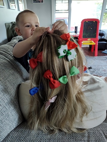 When we got home, we all relaxed around the house. Sam was sitting on the couch and Ella asked if she could brush Sam’s hair. This led to an impromptu hairstyling session.