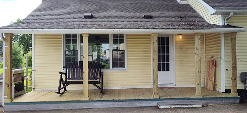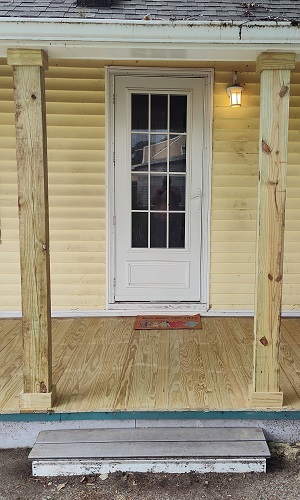 On the porch itself, we put in three new boards. On the ramp, we used 4 long boards to replace 7 boards. As you can see from the above photo, the thought eventually was to just go ahead and replace all the ramp boards. And we did.