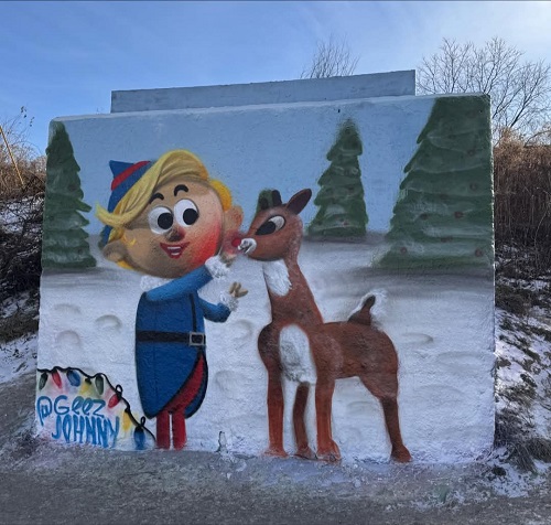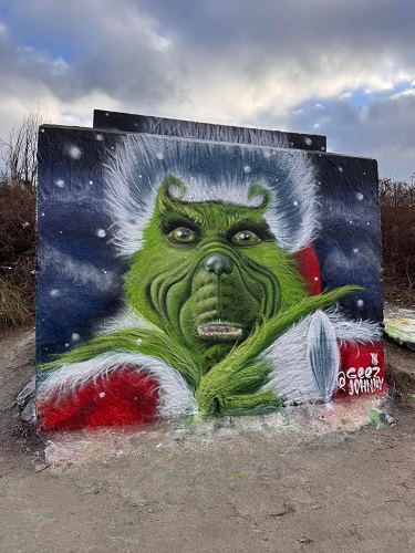 For Christmas, a local mural artist named Johnny Fletcher did his part to get folks in the Christmas season. The first mural, which was featured on many websites, featured the mean one – the Grinch.