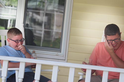 First, after the park, we came home and the boys gamed a bit.  We brought the boys out to the porch and she caught some shots of them just talking.  There is a great pic of the two of them clinking their glass and iced tea bottle together like they are making a toast or something.  One of my favorite shots, though is one of them laughing.  My boy’s laughter fills my heart.  I love when I can make them laugh.  I think I was doing some silly impression of a radio guy I worked with, which made them laugh out loud.  Check out this great shot: