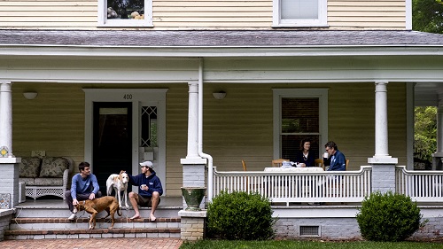 People reading books while sitting on their front porch.