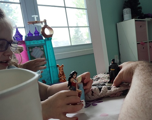 I always try to make her laugh and usually it doesn’t take much. Today, Wonder Woman and Elsa asked Batman to dance. I made a gruff voice and said, “I’m Batman. I don’t dance.” She asked me why and I ad-libbed, “My cape trips me up” and made him fall. I told her, “I have to go fight crime! The Penguin is out robbing banks.” She dug into the Tonie container and said, “No he’s not! He’s right here!”