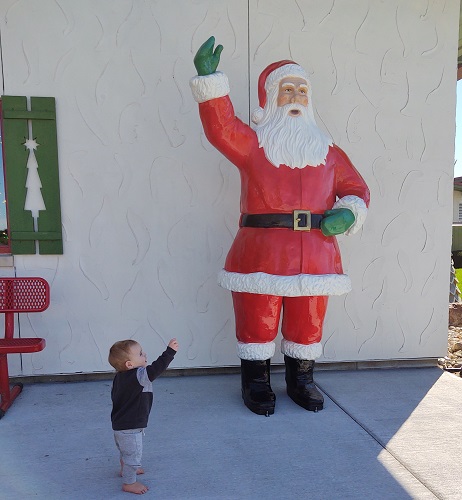 The kids were both getting a bit antsy, so as soon as the plaque was personalized, we headed out. We stopped for photo ops and walked outside. As we exited the building, there was a huge Santa Claus. Andrew saw it and began to point to it. It was a perfect (and frame worthy) photo.