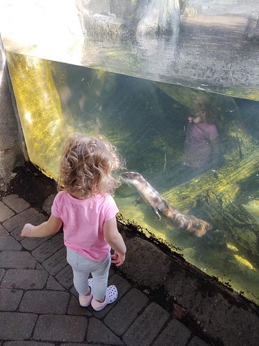 We got there just after it opened, and while there were some other people there, it felt like we had the whole zoo to ourselves. I brought the stroller, but she walked most of the time we were there. The highlight for her (and me) was the otter exhibit. There was this one otter who must have saw us coming. Once we were in front of the window, he jumped in the water and began swimming around in front of her. She was giggling so loud.